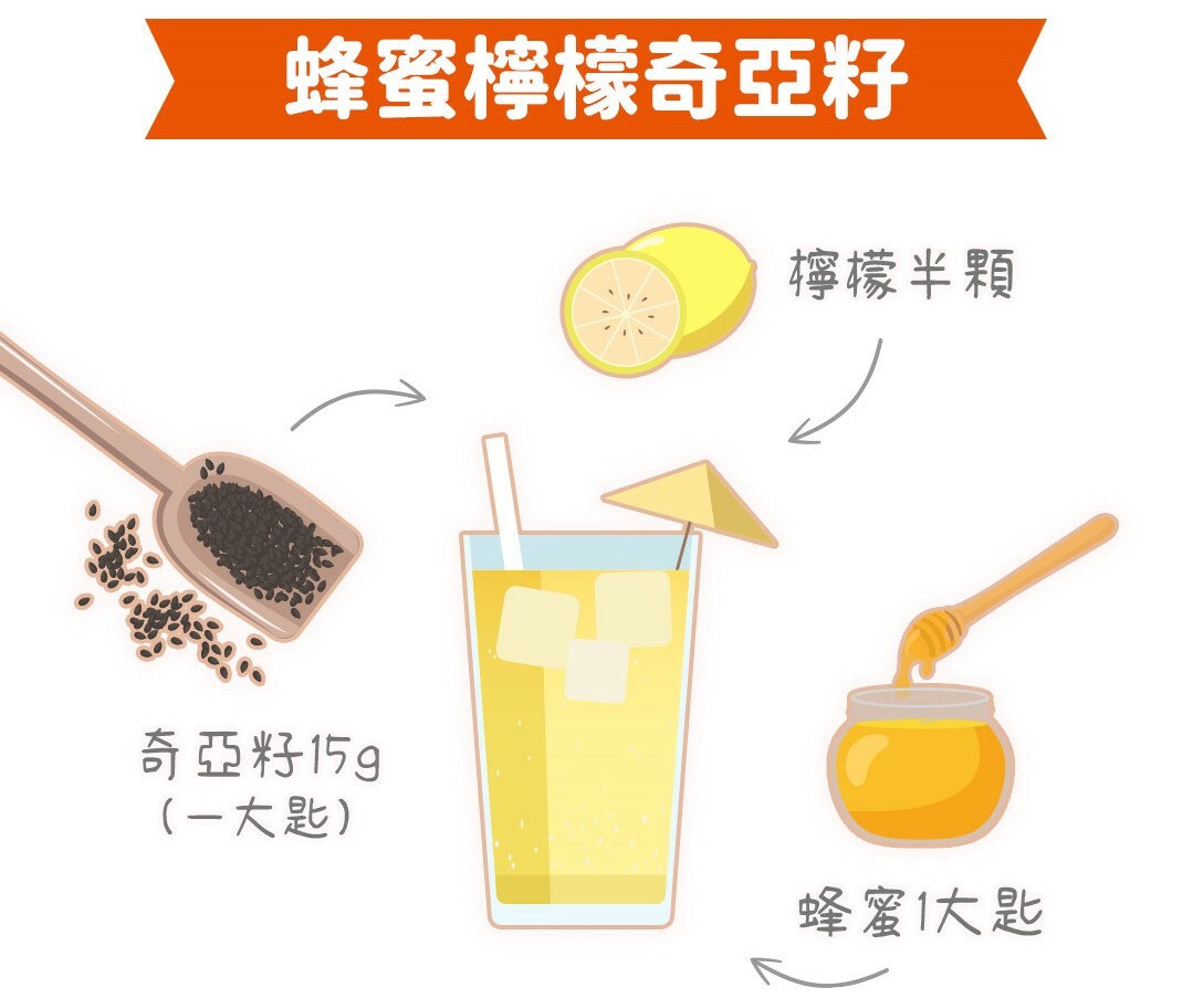 材料:蜂蜜1大匙、檸檬約半顆(可用市售無添加檸檬汁10g代替)、奇亞籽15g(一大匙)