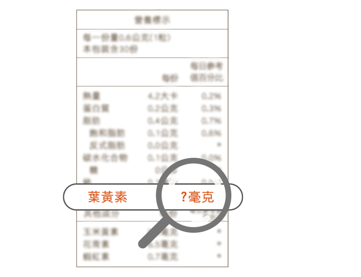 我們在找葉黃素不能單看金盞花萃取物或是葉黃素酯的含量,會因為濃度的差異,故無法100%從萃取物萃取出全成分,而是需要做濃度劑量換算的,所以不妨翻到營養標示,確認葉黃素正確的含量唷!